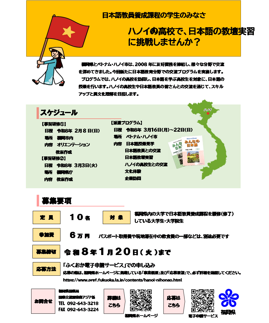 | 日本語教師養成・研修推進拠点整備事業【九州・沖縄ブロック】日本語教師養成コンソーシアム九州・沖縄主催 【CJTT九州・沖縄】オンラインセミナーB「日本語教育の参照枠」とこれからの日本語教師養成 日時 2025年10月25日(土)、11月8日(土)、2026年1月12日(月・祝)(全3回) 時間 第1回、第2回 10:00~12:00 第3回 13:00~15:00 場所:オンライン 参加費:無料 定員 第1回、第2回 各30名 第3回 15名 締め切り 第1回 10月17日(金) 第2回 11月3日(木) 第3回 12月12日(金) (10月30日掲載) |