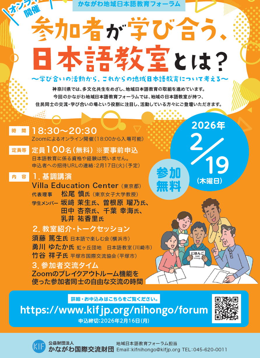 | 一般財団法人日本語教育振興協会 令和7年度生活指導担当者(中堅)研修 一般財団法人日本語教育振興協会では、日本語教育機関における生活指導担当者の能力向上を図るため、生活指導担当者研修を実施しております。今回は、中堅(生活指導担当 3 年程度以上)の方を対象に、 日頃の業務課題の解決及び生活指導担当者としての知識向上、横の繋がりを作りより良い学校運営に繋げることを目的として本研修を実施いたします。是非この機会にご参加ください。 1 日時 令和8年1月23日(金)10:00~17:45 2 会場 国立オリンピック記念青少年総合センター(東京都渋谷区) 3 参加要件 日本語教育機関又は大学・専門学校等教育機関の現場において、通算3年程度以上実際に留学生の生活指導に携わっていること。 4 参加費 維持会員機関 12,000円(税込)/1人当たり その他の教育機関 24,000円(税込)/1人当たり 5 応募締切:令和8年1月9日(金)※応募者多数の場合は締切日より前に募集を終了することがあります。 6 詳細、申込方法 https://www.nisshinkyo.org/news/detail.php?id=3438&f=news 〔問い合わせ先〕一般財団法人日本語教育振興協会 事業部 小野寺陽子 TEL:03-6380-6557 E-mail: nisshinkyo2@gmail.com (12月15日掲載) |
