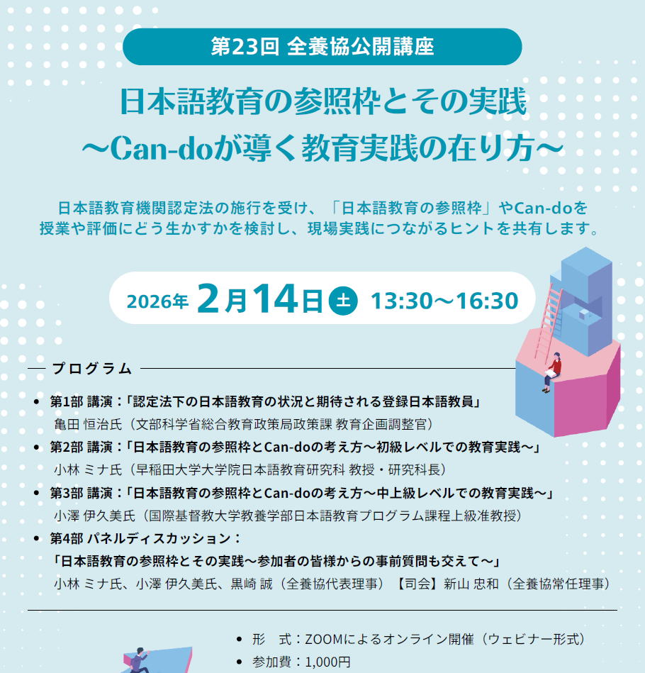 | 日本語教育学会 キャリアパスフォーラム第6弾―「日本語学校の現場Ⅱ」採用担当者側の声― オンライン開催 開催日 2026年2月8日(日)14:00ー16:00 【申込受付締切】2026年1月30日(金)正午(日本時間) (12月26日掲載) |