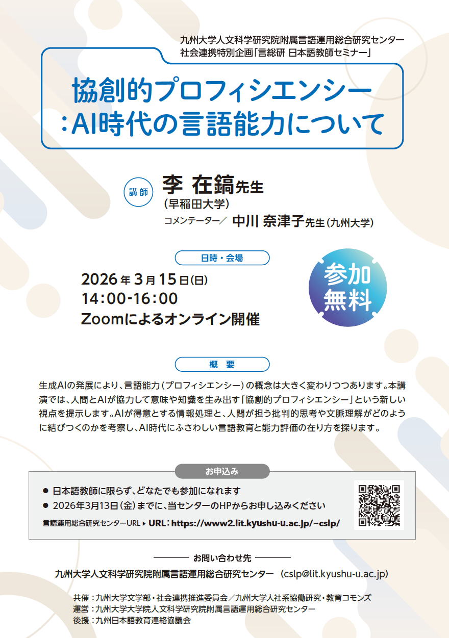 | 第34回アクラスZOOM寺子屋のお知らせ <著者との対話>:あらためて「日本語教育の参照枠」を読み直す 第34回アクラスZOOM寺子屋は、出版されたばかりの『あらためて「日本語教育の参照枠」を読み直す』を取り上げ、<著者との対話>を行います。 さまざまな所で取り上げられている「参照枠」ですが、適切に理解されているとは言えない現状があります。 対話を通して、改めてみんなで考えてみる時間にしたいと思います。 日時:2026年3月11日(水)19時~21時 講師:神吉 宇一氏(武蔵野大学 教授) 定員:25人 (1月27日掲載) |