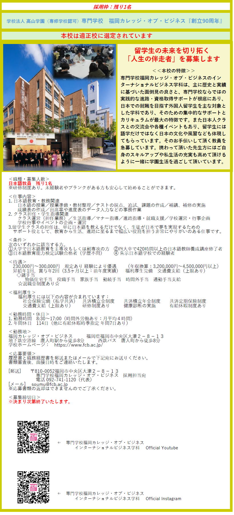 【募集職種】 専任講師1名 ・ 非常勤講師 2名 【仕事内容】 <専任講師> 教務業務全般・学校運営に関わる業務 <非常勤講師> ① 外国人留学生への日本語指導(採点業務などはありません) ② 外国人介護職員を対象とした、日本語と介護スキルのオンライン指導 ご応募の際に①または②、もしくは①②両方など、希望の業務をお伺いします。 【優遇条件】 1 「できる日本語」での指導経験者 ※経験がなくても可 2 介護関連の日本語指導の経験者や介護福祉士などの資格保持者 【勤務時間】 <専任講師> 8:30~17:30 <非常勤講師> 1 午前か午後のどちらか希望をお伺いします。 午前9:00~12:30 午後13:15~16:45 2 対象の就労者と調整の上、決定します。1回の授業は通常2時間です。 【給与】 <専任講師> 月給25万~ 交通費支給 <非常勤講師> 授業給 2,560円~(1時間) 昇給あり ※1日の授業は3時間になります 事務給 1,057円(1時間) ※授業日は授業前の準備、出席簿記入、授業報告の記入などの雑務給として45分の事務給をお支払いします。 また、その他、勉強会、研修、 授業以外の業務に関しましては時間に応じた事務給をお支払いします。 担任手当(20,000円)。 交通費支給。 【応募資格】 下記の①~④いずれか1つ以上に該当している方 ①最終学歴が四大卒以上かつ日本語教師養成講座(420時間以上)修了者 ②日本語教育能力試験合格者(学歴不問) ③大学において日本語教育に関する主専攻または副専攻を修了 ④登録日本語教員資格保持者 【勤務地 】 福岡県 福岡市博多区 堅粕4丁目4-3 JR博多駅から徒歩13分 【採用締め切り】 2026年5月30日(採用が決まり次第終了) 【選考フロー】 ①書類審査 ②面接・模擬授業 【応募方法】 履歴書及び職務経歴書をメールまたは郵送でお送りください。 【連絡先】 〒812-0043 福岡県福岡市博多区堅粕4丁目4-3 福岡国際学院 採用担当:真部/井上 Tel:092-441-1032 Mail: info@f-i-a.jp HP: https://www.f-i-a.jp/ Instagram: https://www.instagram.com/fia_fukuoka_international/ |