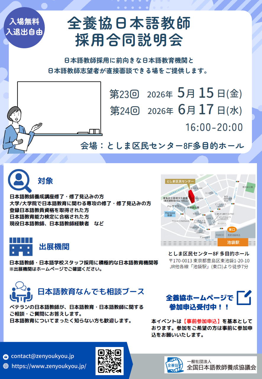 ■学校名 新日本学院 ■勤務地 〒197-0013 東京都福生市武蔵野台1-3-2 JR青梅線「福生」駅から徒歩12分、JR八高線「東福生」駅から徒歩1分 ■条件 勤務開始日は要相談 [専任] 下記の①及び②~④のいずれかに該当する方。 ①四大卒以上 ②大学での専攻・副専攻修了者 ③日本語教育能力検定試験合格者 ④日本語教師養成講座420時間修了者 ※経験者優遇 [非常勤]四大卒以上で下記の①~③のいずれかに該当する方。 ①大学での専攻・副専攻修了者 ②日本語教育能力検定試験合格者 ③日本語教師養成講座420時間修了者もしくは修了見込み者 ・週2日(1日45分×4コマ)以上勤務できる方優遇 ・未経験者応募可能(研修制度あり) ■募集人数 専任1名 非常勤2~3名 ■待遇 ※専任・非常勤ともに登録日本語教師 取得補助あり(一律20,000円) 【専任】 担当の仕事、役職に応じたステージ制度をとっています。 給与はステージに応じて決定します。 ステージⅠ 21万円~26万円 ステージⅡ 23.5万円~28.5万円 ステージⅢ 26万円~31万円 例)未経験・新卒の方の一例 21.5万円~、教員経験1年以上の方の一例 25万円~ ※ご経験、入社時の模擬授業で決定します。賞与:年2回 昇給:年1回 ●各種手当●交通費実費支給・マイカー通勤可、社会保険加入、退職金制度あり、定期健康診断、ランチ補助制度あり産休・育休制度、慶弔休暇、介護休暇、誕生日お祝い制度 【非常勤】時給 2200円以上(事務処理手当含む)※経験により優遇 1日4時間勤務 午前クラス:9:00~12:15+事務処理 午後クラス:13:30~16:45+事務処理 ※授業の担当は3ヶ月〜半年ごとに希望を聞いて決めます。 例)週2、未経験の場合 2200×8(4コマ2日)=¥17,600 +交通費 ※授業の担当は3ヶ月〜半年ごとに希望を聞いて決めます。 ●各種手当● 交通費実費支給・マイカー通勤可 担任手当、進路指導手当、行事手当(遠足引率、式典参加など)、会議手当(学期前のクラスMTなど)、研修手当(長期休みの勉強会への参加など)、各種採点手当(課テスト、修了テスト採点など)職員健診助成金制度、ランチ補助制度、誕生日お祝い制度 ※勤務年数やコマ数に応じて社会保険加入制度あり ■応募方法 履歴書(写真付)を郵送またはメールにてお送りください。※これまでの指導経験歴を必ずご記入ください。 書類審査の上、追って面接(模擬授業あり)の日時をご連絡いたします。 ■応募締切日 2026年1月31日 *ただし決まり次第終了 ■連絡先 〒197-0013東京都福生市武蔵野台1-3-2 担当者 教務課採用担当 電話042-553-6420 FAX042-530-2455 Eメールrecruit_m_group@nja.co.jp ■備考 学生数増加に伴う募集です。週2から入れる先生を大募集しています。 ●未経験の先生でも安心してスタートができるサポートが充実しています。 ・絵カード、文型カード、フラッシュカードなど共有の教材常備 ・新人研修 教案作成時のポイント、教案チェック(1~3ヵ月)、専任の授業の見学 担当者による授業見学とFB、定期的な相談会の実施 ・長期休みの勉強会の実施 ・教材購入10%オフ ●新卒の先生からシニア世代の先生まで幅広い年代の先生が活躍中です。子育てしながら働いている先生も多く、急なお休みや早退にも対応しています。 学校見学随時受付中です。お気軽にご連絡ください。 HP:https://www.nja.co.jp/ Instagram:https://www.instagram.com/new_japan_academy/ FaceBook:https://www.facebook.com/nja.co.jp |